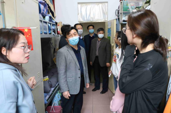 4月13日下午,在校党委书记郝勇东,党委副书记、院长茹文明的带领下,我校领导班子全体成员一行前往北校学生宿舍实地看望首批返校学生和入住封闭区的系部教师。