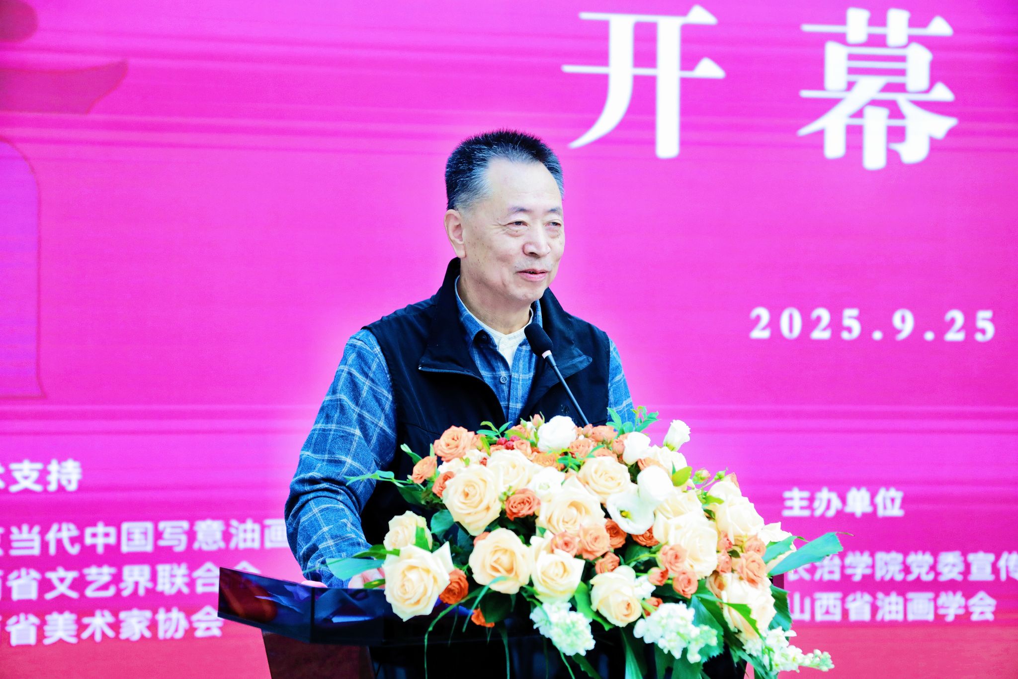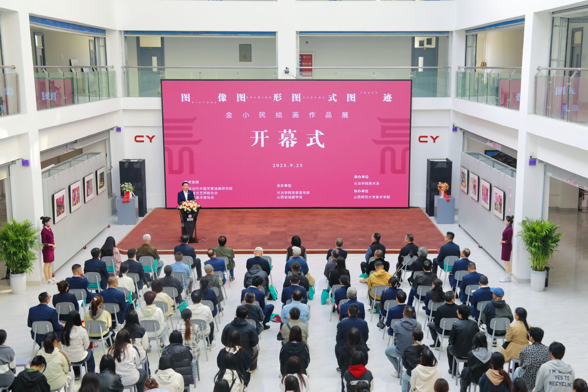9月25日上午,金小民绘画作品展开幕式在我校南校区3号教学楼1层举行。山西省文联主席、山西大学文学院教授葛水平,中国傩戏学研究会副会长、山西师范大学教授延保全,山西省油画学会会长周毅,中国美术家协会会员、山西师范大学美术学院教授金小民、校党委书记曹景川、校党委副书记史晓东出席活动。山西省美术家协会、山西省油画学会、长治市美术家协会以及山西省内兄弟院校专家学者,我校党委办公室、党委宣传部、美术系领导班子和师生代表参加。开幕式由史晓东主持。