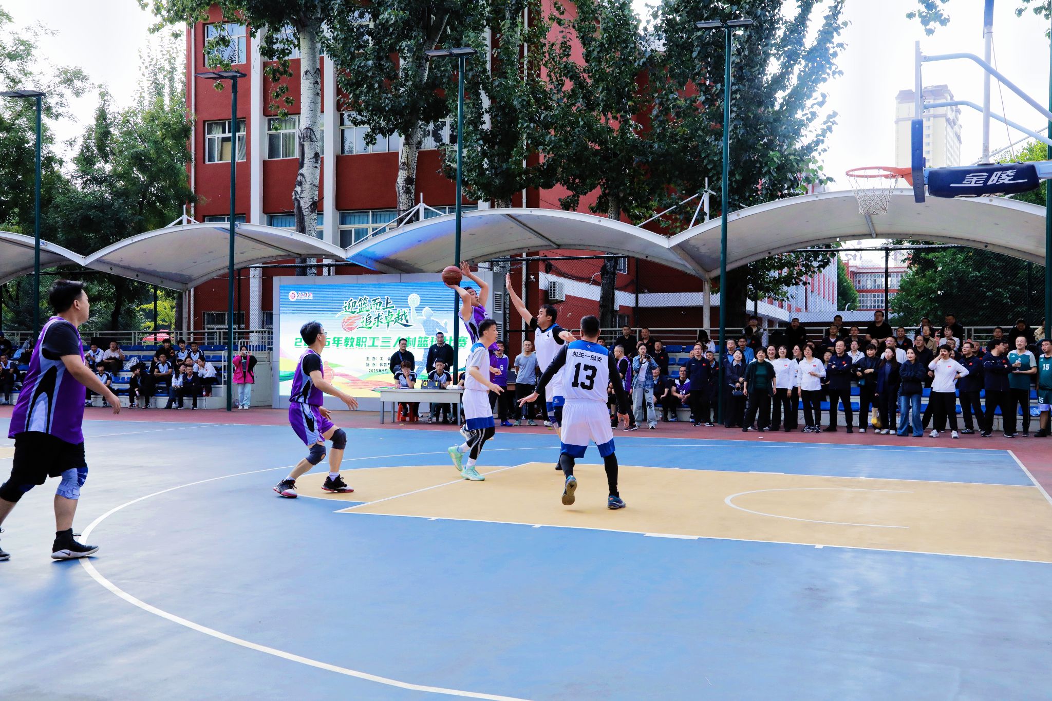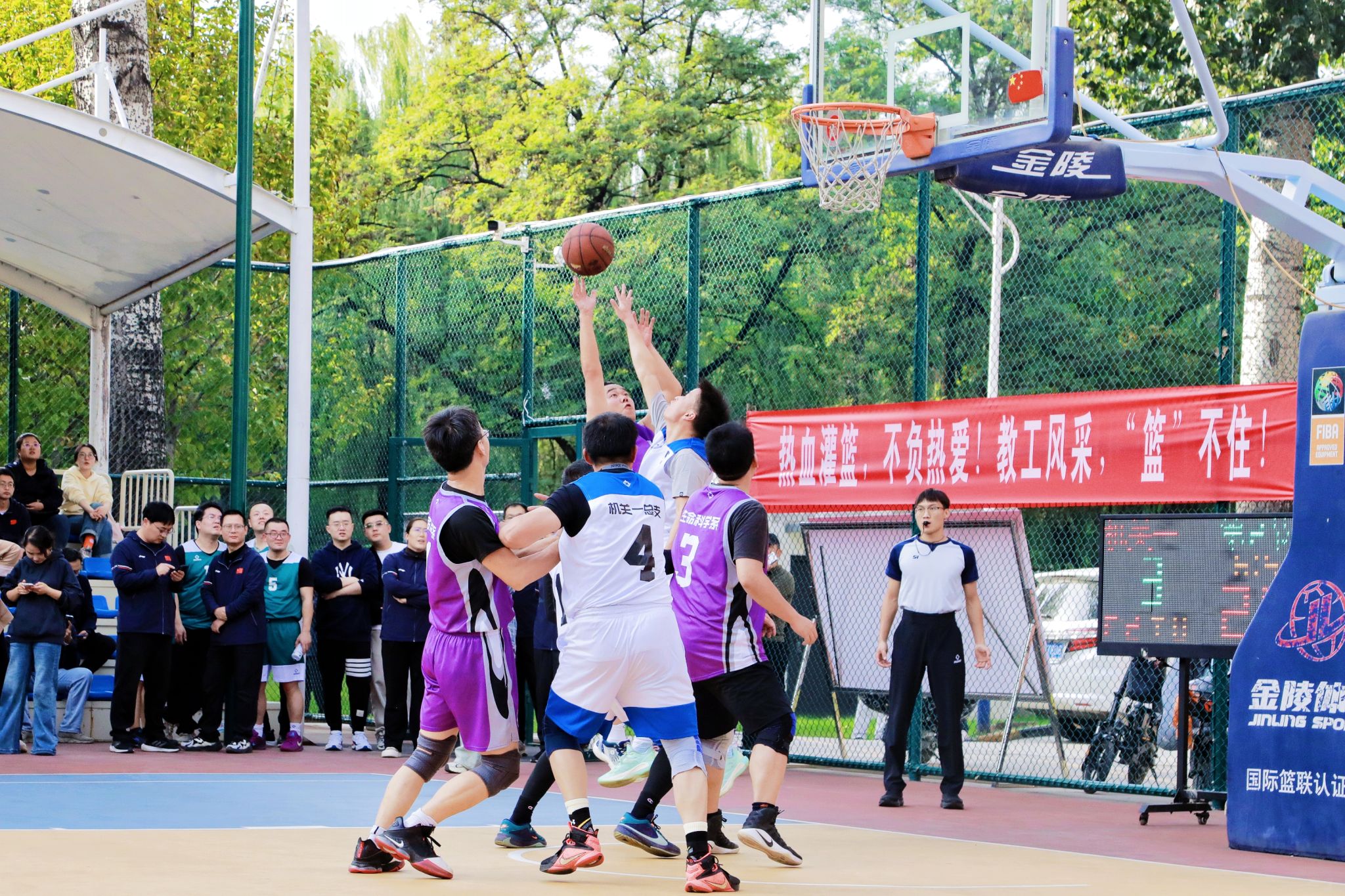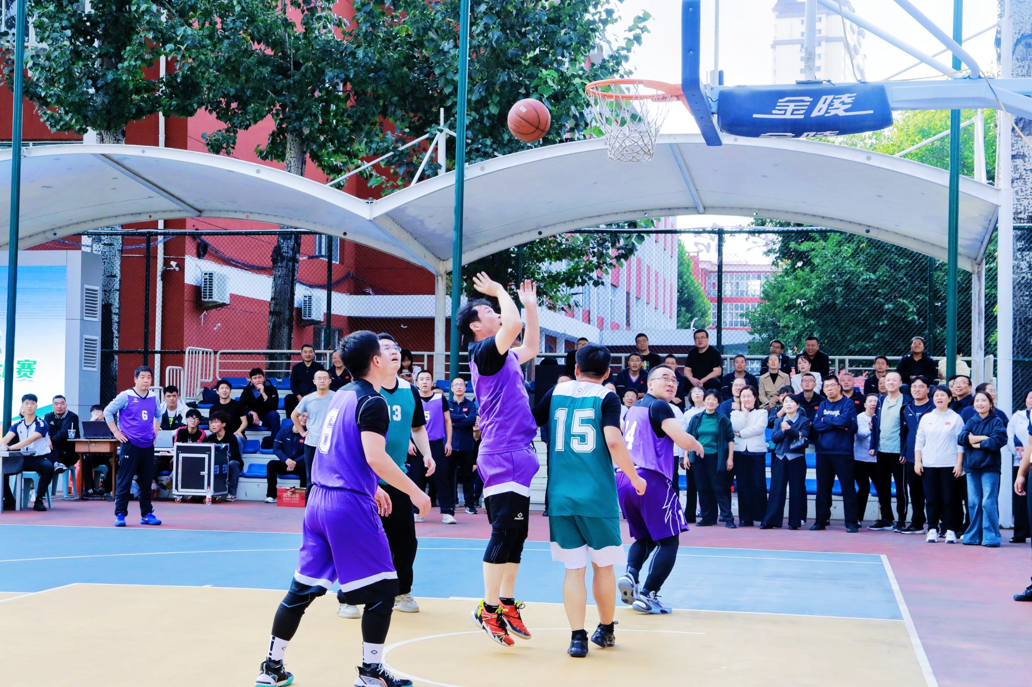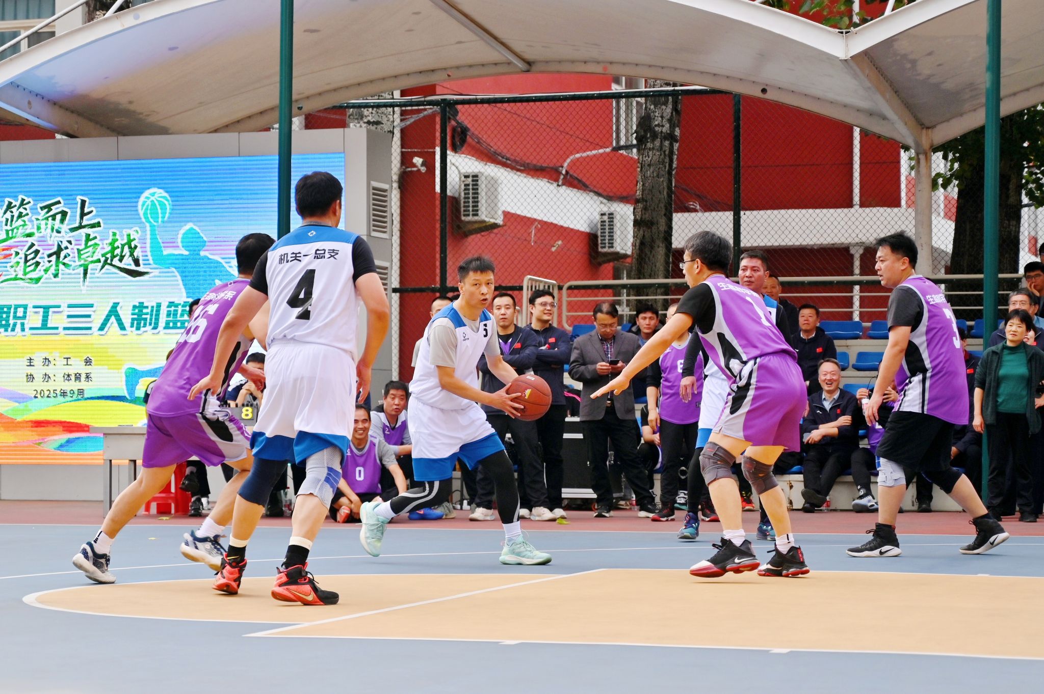决赛现场高潮迭起,观众欢呼声、呐喊声此起彼伏。教职工们化身为篮球健将,斗志昂扬,全力拼搏。精彩的传球、精准的远投、迅猛的突破、坚固的联防,每一个瞬间都展现出精湛的球技和高效的团队协作。