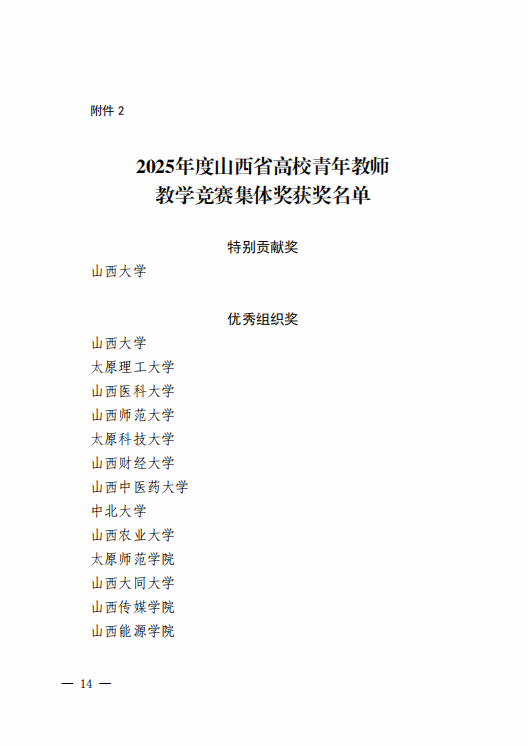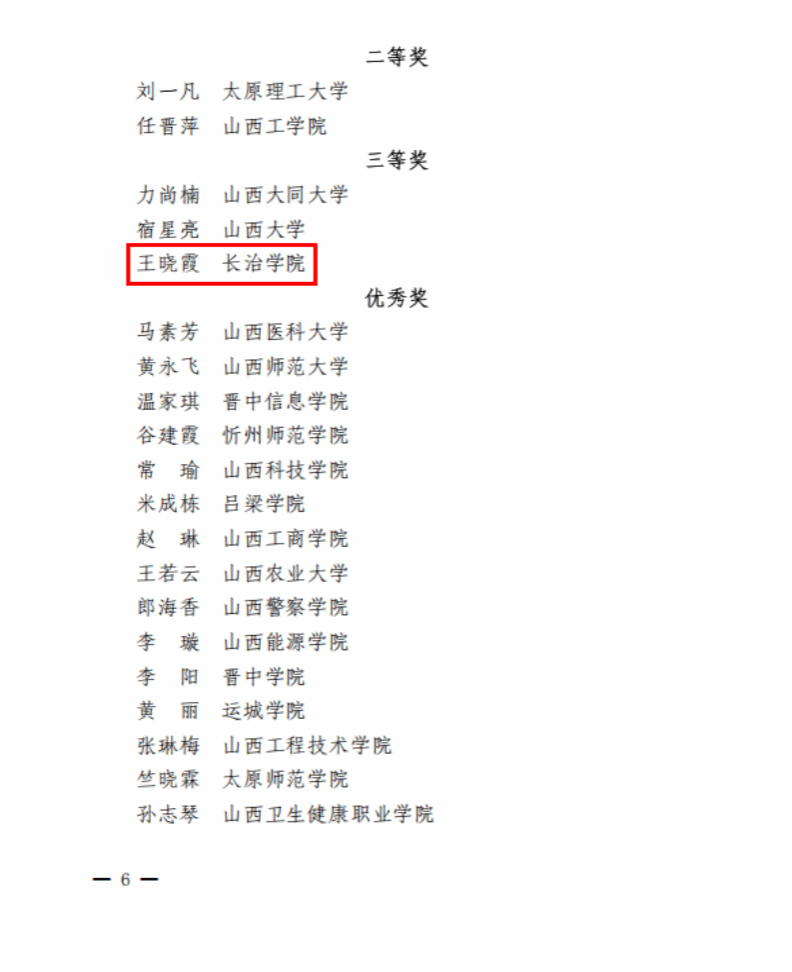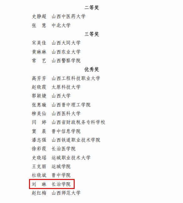 10月26日至10月31日,由山西省总工会、山西省教育厅、山西省教科文卫体工会主办的2025年度山西省高校青年教师教学竞赛决赛在山西大学举行。我校教师王晓霞、刘琳、李蒙召、刘云卿分别参加理科、工科、医科、思想政治四个组别赛事。经过激烈角逐,王晓霞获理科组三等奖,刘琳、李蒙召、刘云卿分别获得工科组、医科组、思政课组优秀奖。长治学院获优秀组织奖。