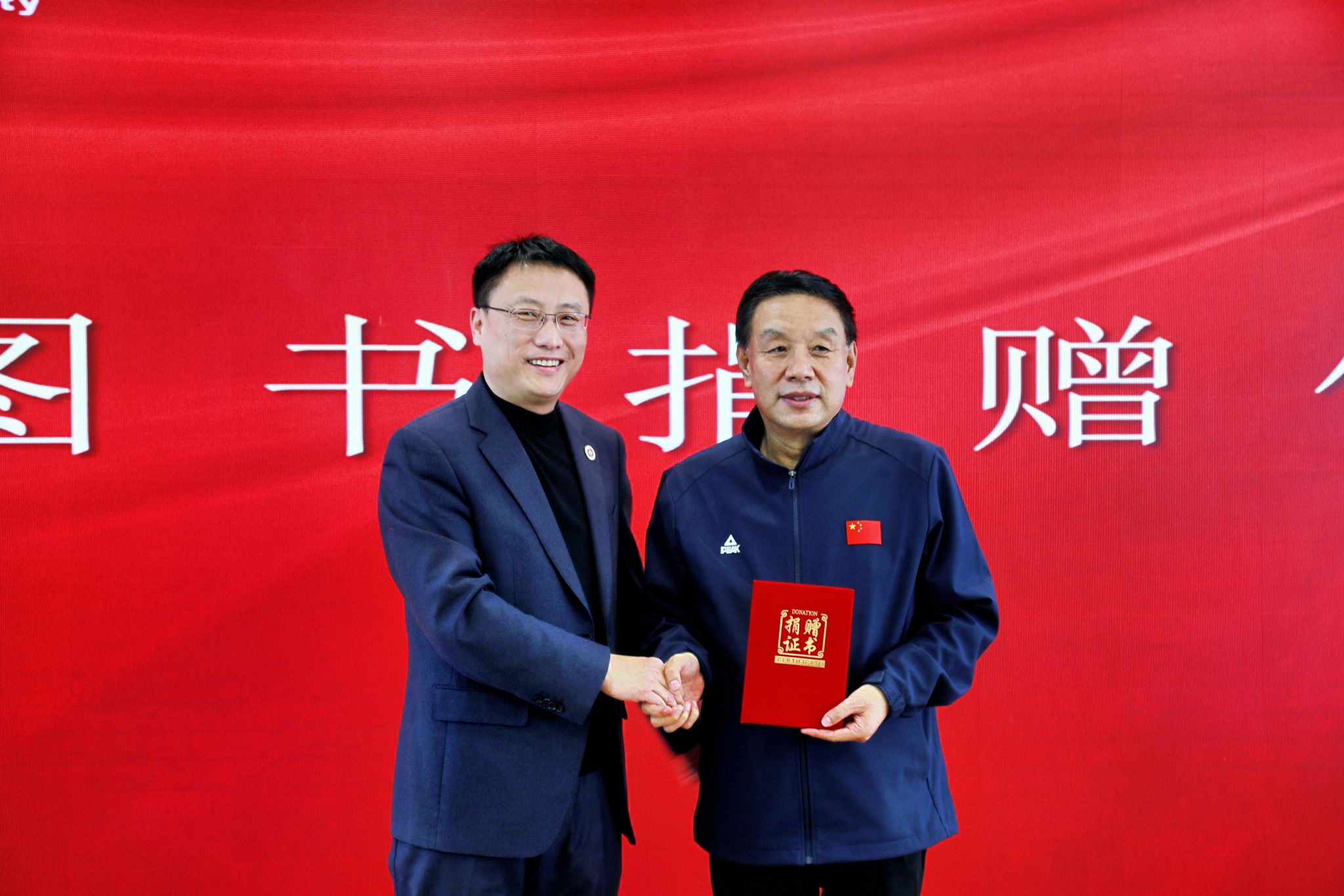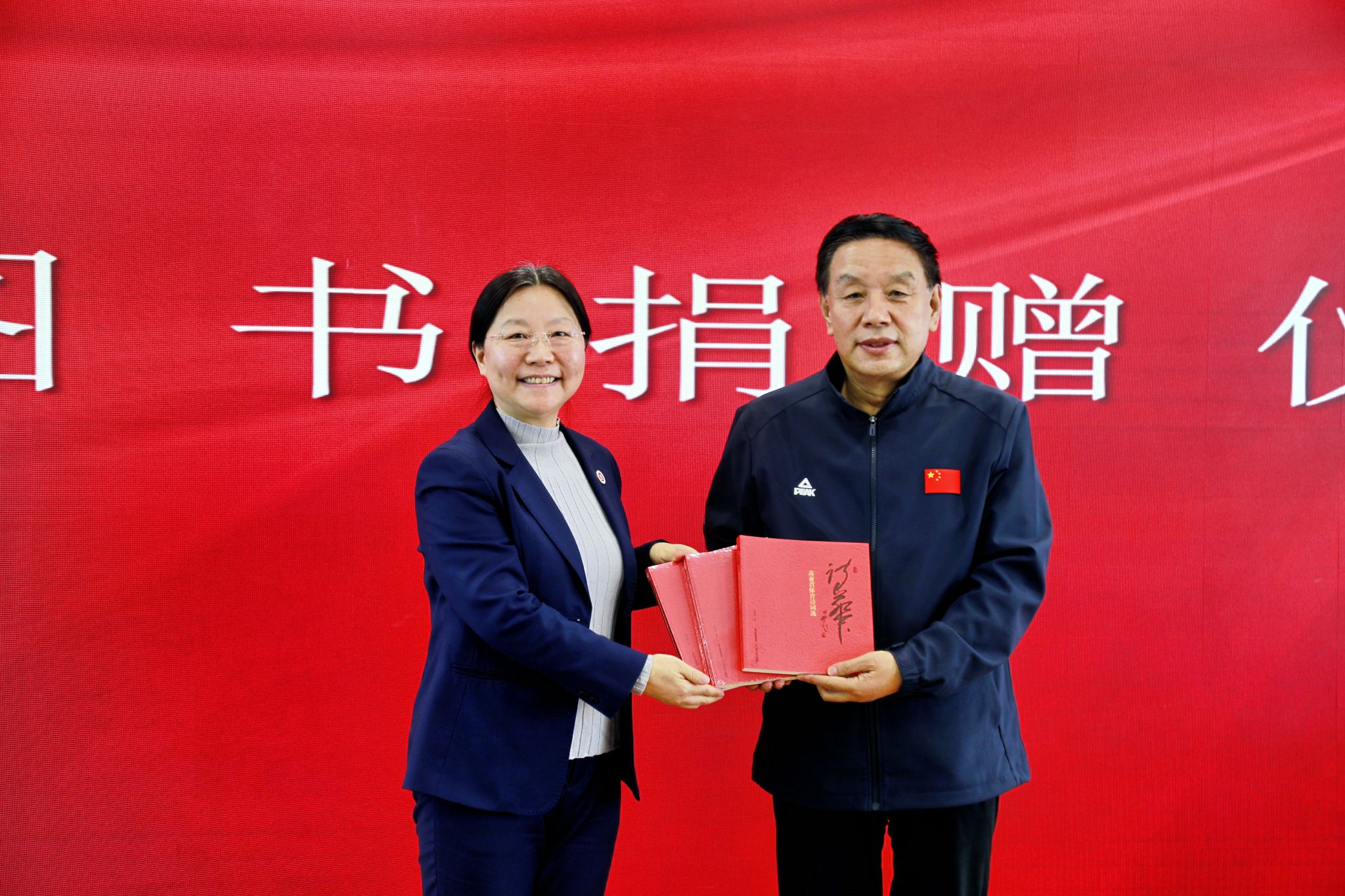 在赠书仪式中,苏亚君向我校图书馆捐赠个人代表作《诗华——苏亚君体育诗词选》。曹景川向苏亚君颁发捐赠证书。我校图书馆馆长秦楼月代表学校接受赠书。
