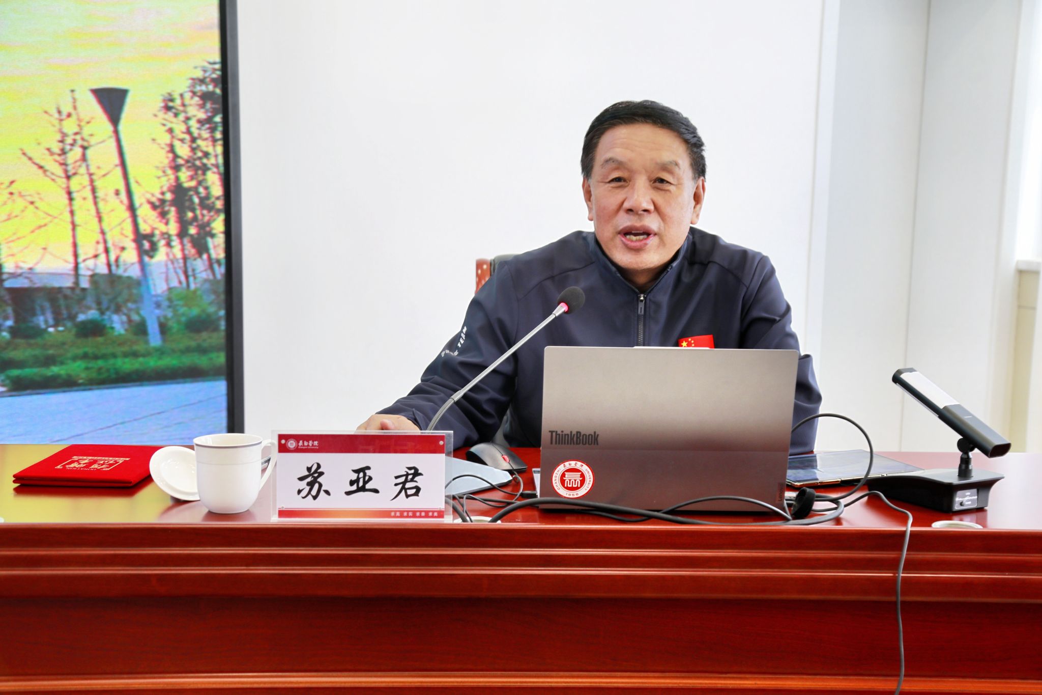 曹景川在主持讲话中代表学校对苏亚君的到来表示热烈欢迎。他指出,苏亚君长期扎根体育事业,在体育管理、群众体育推广和体育文化建设等方面成绩卓著,为推动我省体育事业发展作出了重要贡献。同时,苏亚君积极倡导体育与文学同向同行,通过创作多部富有思想深度与艺术价值的文学作品,生动展现了体育文化的精神内涵与时代光彩,是我国体育文化创新发展的坚定实践者和有力推动者。