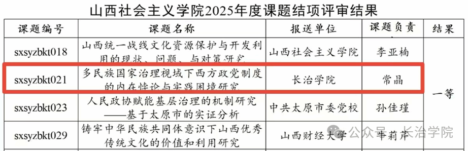 近日,山西社会主义学院公布2025年智库课题结项评审结果,我校马克思主义学院教授常晶的《多民族国家治理视域下西方政党制度的内在悖论与实践困境研究》结题鉴定荣获“一等”等级。