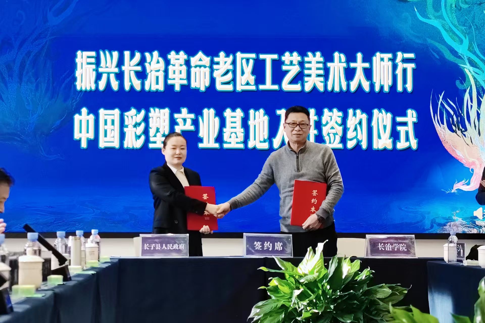 活动现场,长子县委书记牛志强与我校党委书记曹景川共同为 “长治学院彩塑产业学院” 揭牌,标志着校地在彩塑艺术人才培养、产业研发等方面的合作迈入新阶段。美术系主任代表学校,正式签署入驻长子彩塑研学基地协议,为后续校地联合开展研学实践、艺术创作、成果转化搭建了坚实平台。校领导与美术系教师代表还参与了 “中国彩塑之都” 学术研讨会,与全国知名雕塑家、工艺美术大师深入交流,为高校艺术教育对接地方文化产业积累了宝贵经验。
