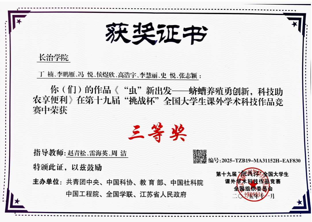 近日,第十九届“挑战杯”全国大学生课外学术科技作品竞赛在南京大学仙林校区圆满落幕。由我校赵青松、雷海英、周洁指导,生命科学系丁楠、李鹏雁、冯悦等同学完成的项目《“虫”新出发—蛴螬养殖勇创新,科技助农享便利》荣获三等奖。