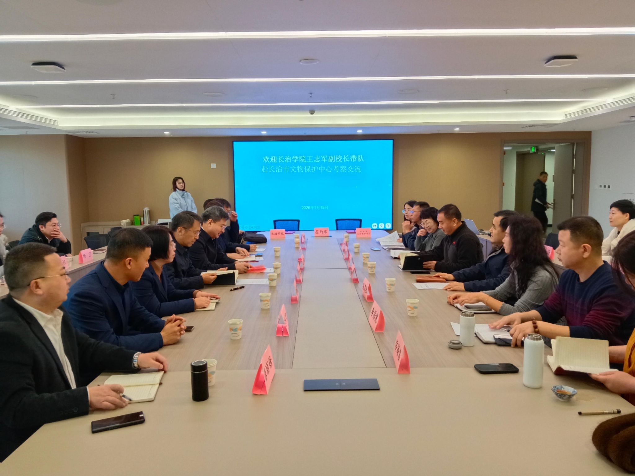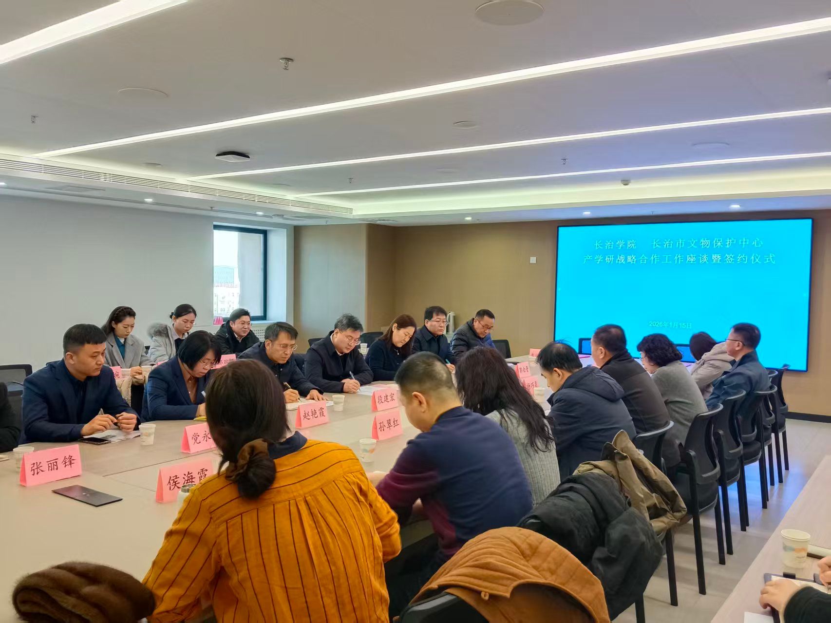 1月15日,我校与长治市文物保护中心产学研战略合作工作座谈暨签约仪式在长治市文保中心大会议室举行。校党委委员、副校长王志军出席活动。长治市文保中心主任郜治平、副主任杨巧灵、郭俊斌及相关科室负责人,与我校科研部、就业创业指导中心、历史与旅游管理系教师代表共同参加会议。