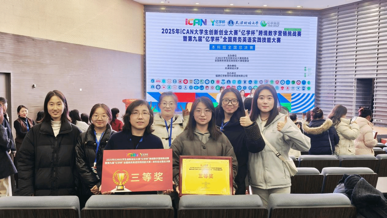 11月29日,2025年iCAN大学生创新创业大赛“亿学杯”跨境数字营销挑战赛全国总决赛在天津财经大学圆满落幕。由我校外语系陈新老师指导,商务英语专业学生申鑫南、舒君娜、胡洋、杨嘉怡、张婧芸五位同学组成的参赛团队,经过多轮角逐,最终荣获全国三等奖。