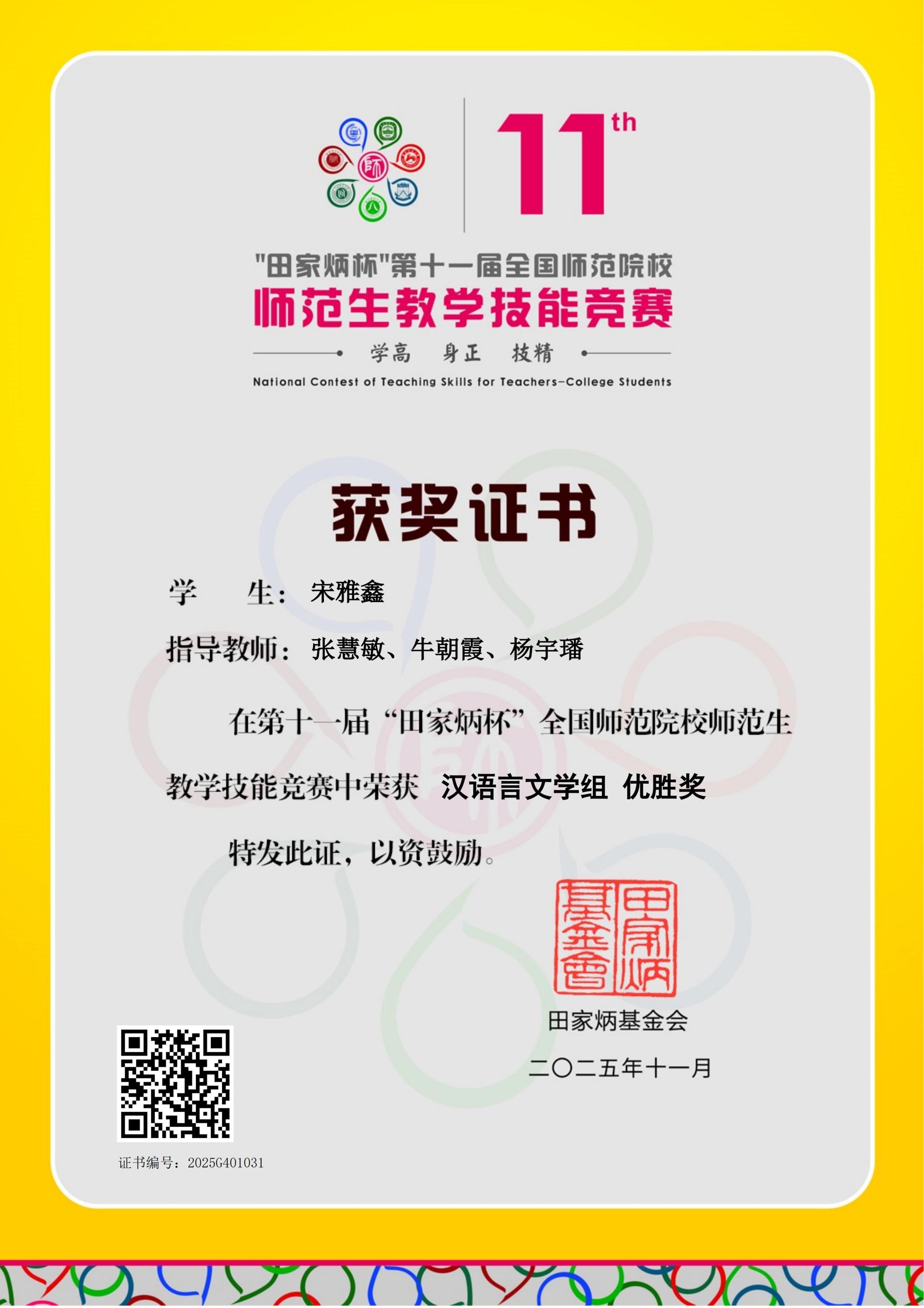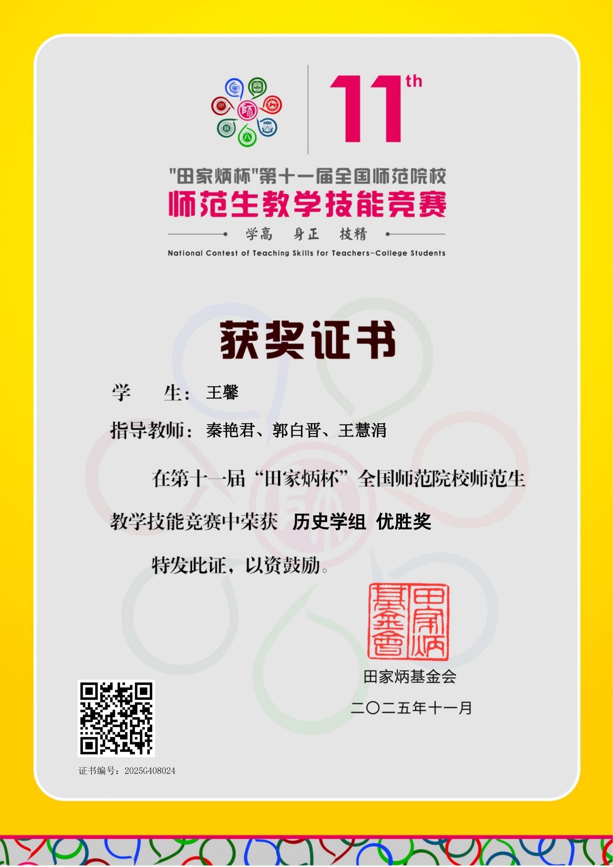 近日,第十一届“田家炳杯”全国师范院校师范生教学技能竞赛圆满落幕。我校高度重视赛事组织与选拔工作,精心推荐13名优秀师范生参赛。经过激烈比拼,3名同学脱颖而出,取得优异成绩,其中2名同学荣获优胜奖,生命科学系李一凡同学成功入围全国决赛并荣获一等奖。