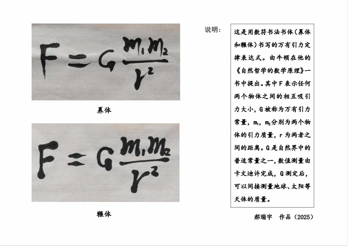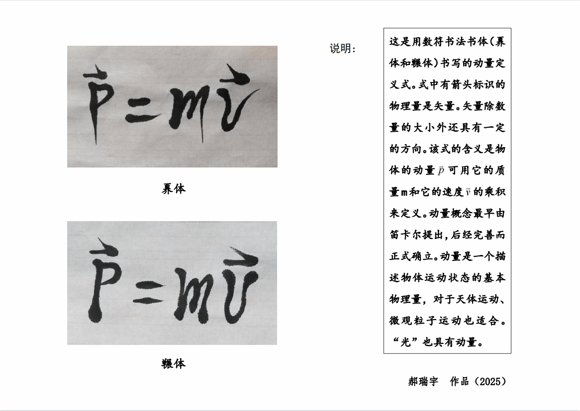 数符书法,以数字、字母、符号等为表现对象,用毛笔呈现科学理论公式,是一种新的科普载体和美育载体,可应用在科学公式科普、文化传播和美育等活动中,有助于人们欣赏特殊线条形态表现的科学公式,感受自然演化韵律,体会科学美和艺术美。近年来,长治学院科普研究所郝瑞宇教授团队,主要以奡体(矫健端肃)和冁体(圆润活泼)呈现动量定义式、角动量定义式、万有引力定律表达式等,在此领域取得原创性成果。