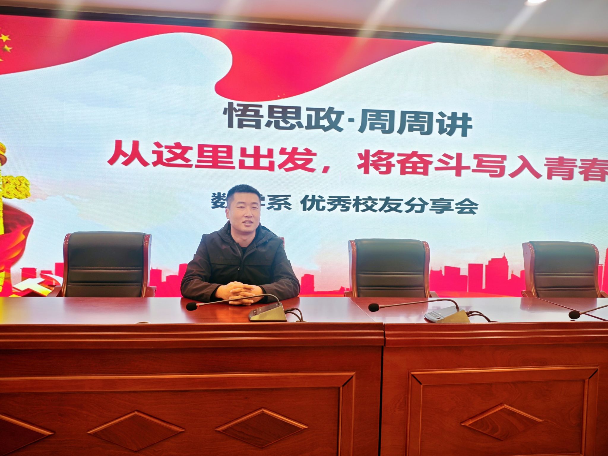 9月22日上午,数学系“悟思政·周周讲”之优秀校友分享会在南校区1号会议室举行。本次分享会以“从这里出发,将奋斗写入青春”为主题,特邀我系优秀校友温东升重回母校,与在校学子面对面分享他的成长历程与奋斗感悟,为学弟学妹们带来一堂生动而深刻的“大思政课”。