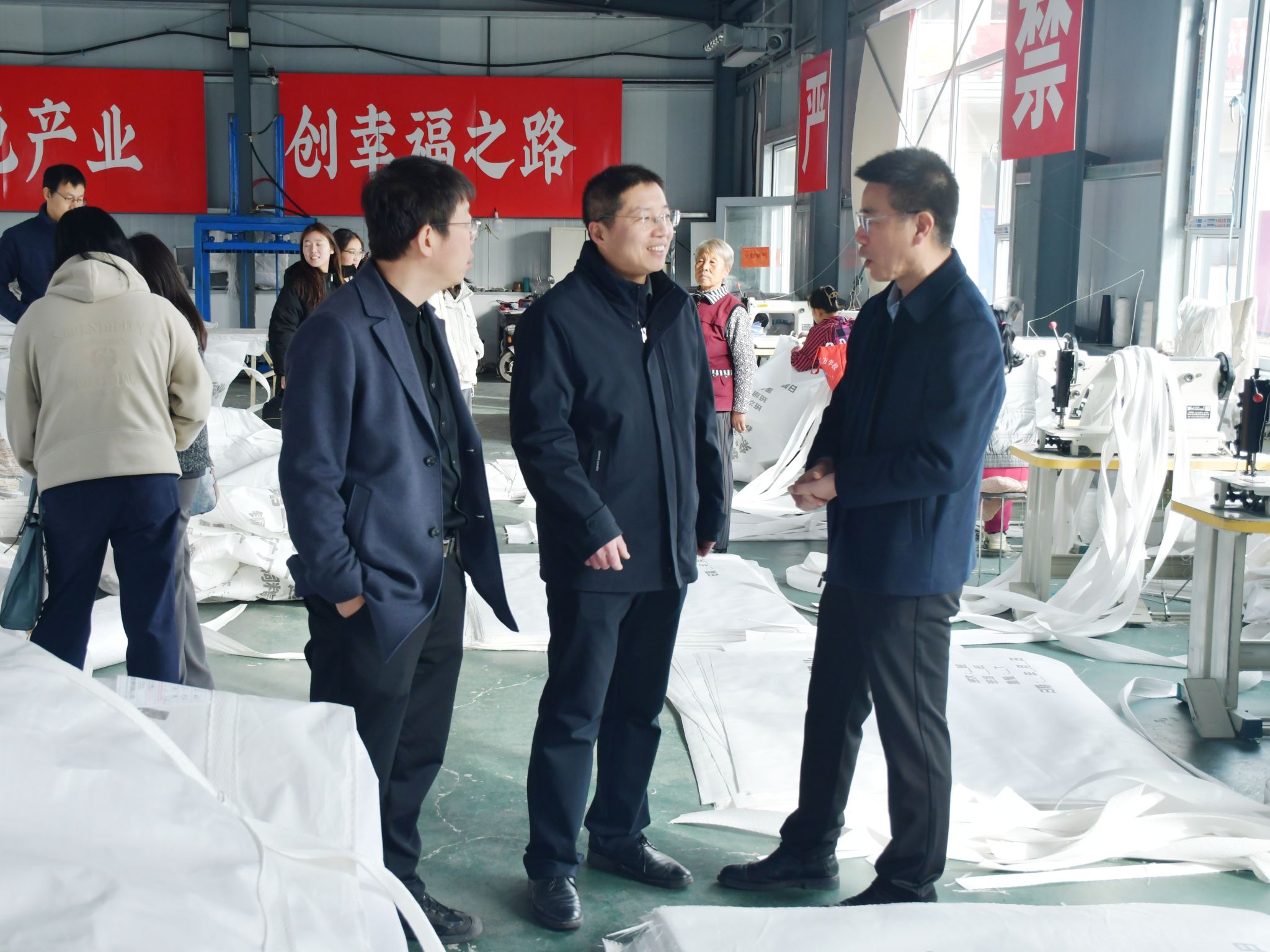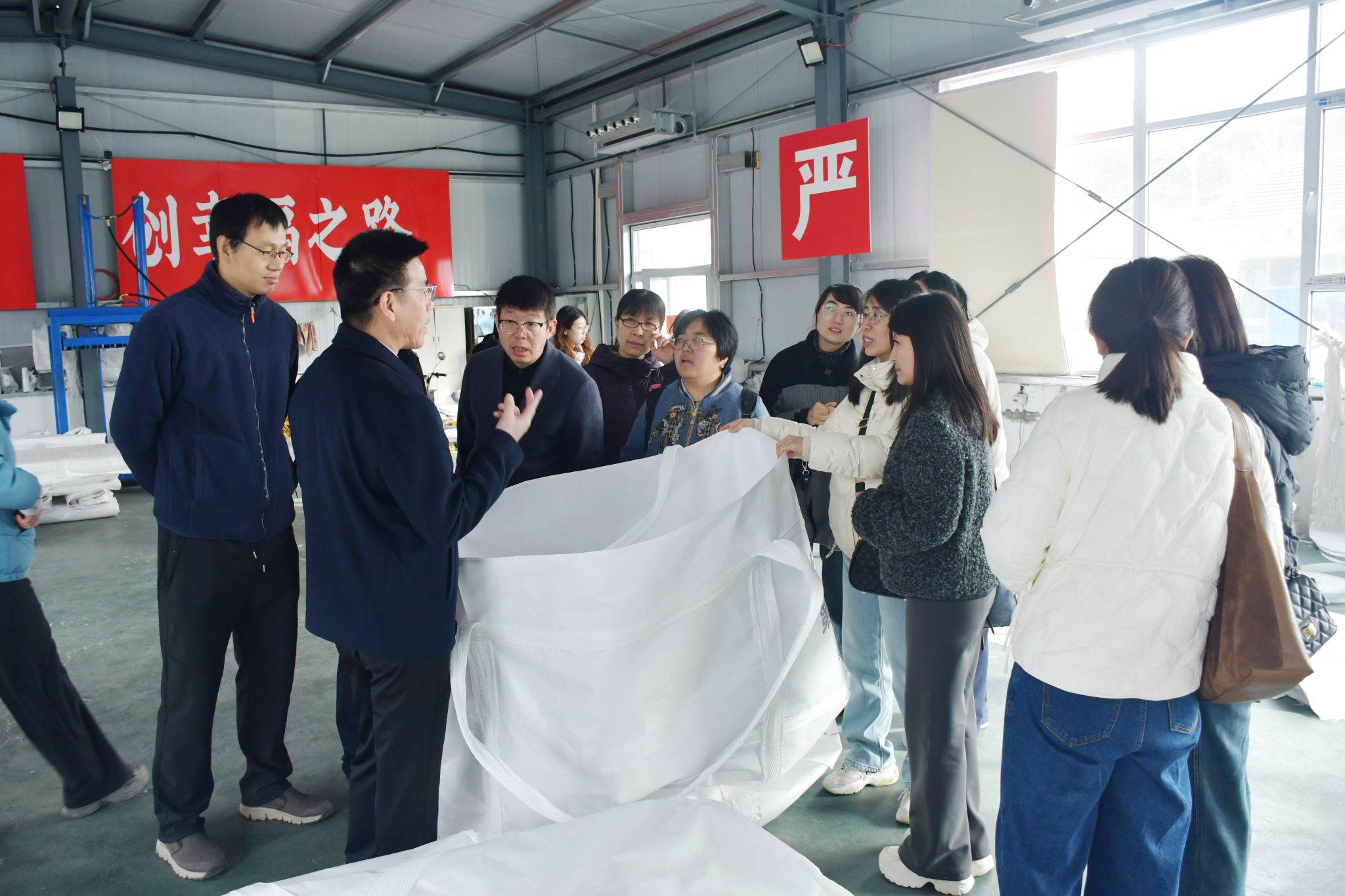 全体党员走进峪口村吨包车间,实地观摩生产流程与运营模式,详细了解产业规模、技术需求和市场前景,切身感受党建引领下乡村产业发展现状。