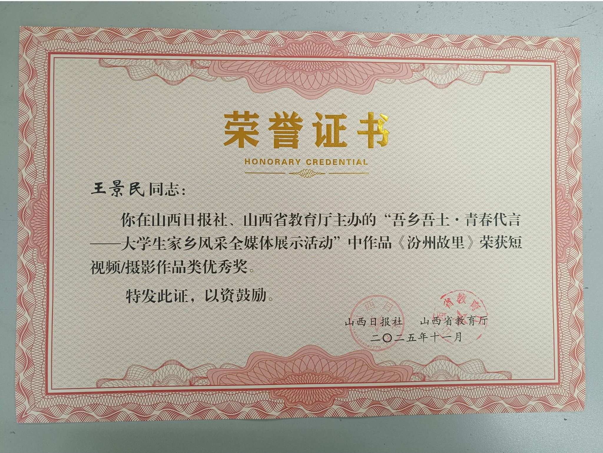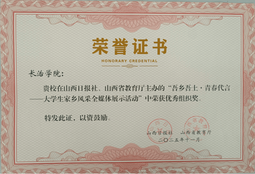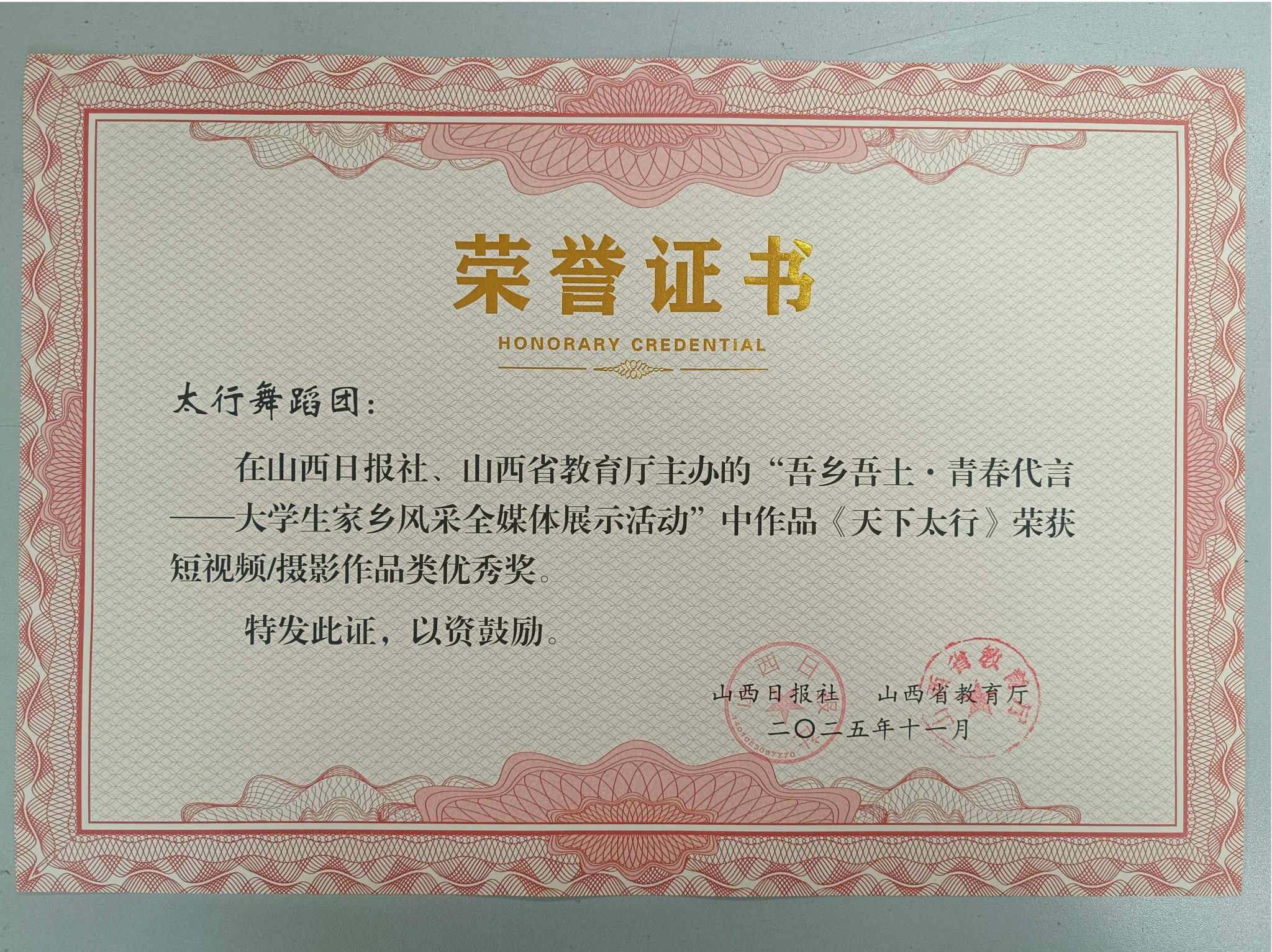 近日,由山西日报社、山西省教育厅联合举办的“吾乡吾土·青春代言——大学生家乡风采全媒体展示活动”圆满落幕。活动以图文、短视频、音频、思政课视频、创意设计等多种形式,生动呈现三晋大地的风土人情、历史文化与时代风貌。我校在活动组织、作品报送和学生参与等方面表现突出,荣获“优秀组织奖”。